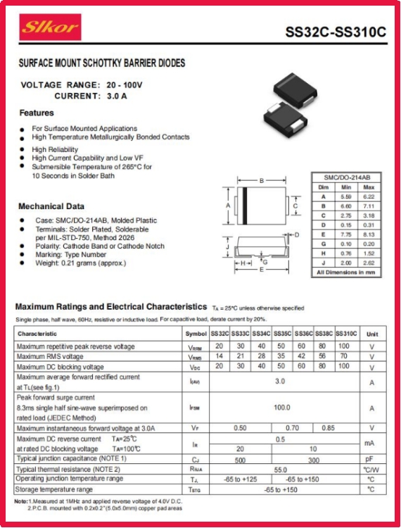 在當今科技飛速發展的時代,電子設備如同繁星般點綴著我們的生活,從日常的智能手機、家用電器,到工業領域的自動化設備、能源系統,電子技術無處不在。而在這些電子設備的內部,有一個看似微小卻起著關鍵作用的元件——肖特基二極管。薩科微slkor生產的SS34C高性能肖特基二極管,就像電子世界的高效“心臟”,為各類電子設備注入強大動力。