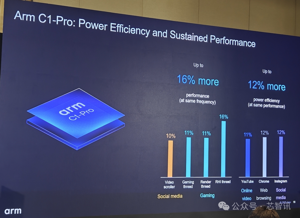 C1-Pro的定位是最高能效的大核。在微架構(gòu)層面,Arm C1-Pro 引入了增強型分支預測和內(nèi)存系統(tǒng)更新,尤其適用于實際用例中的多任務處理。