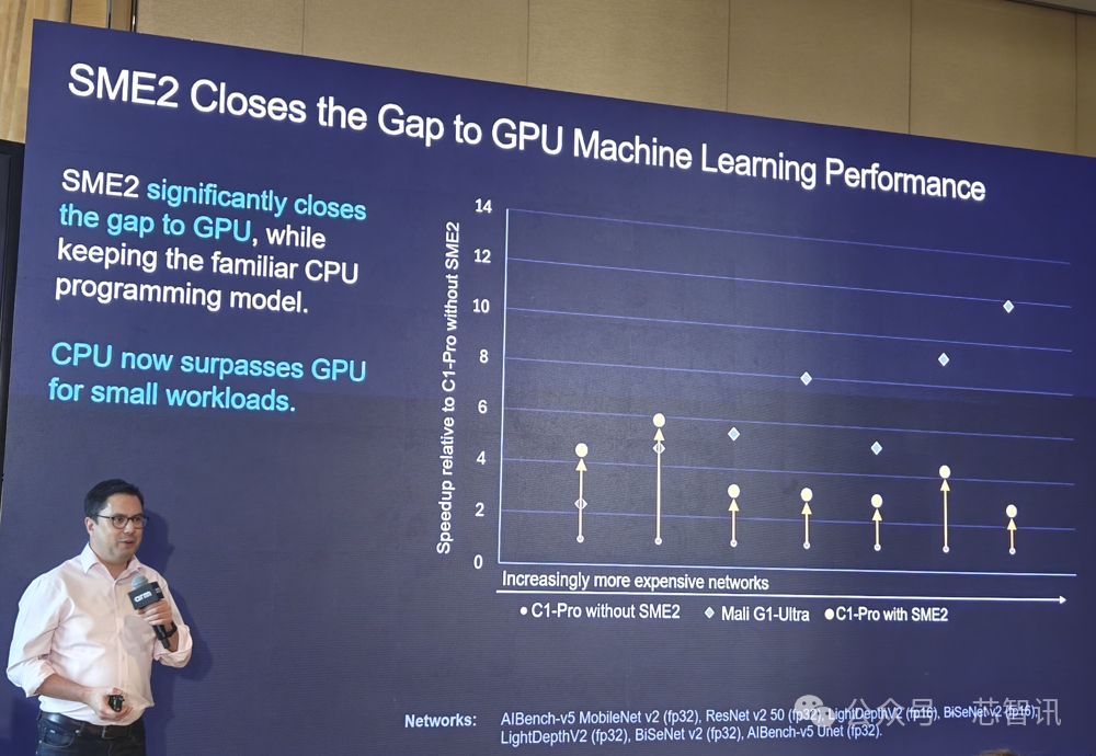 Arm表示,SME2 顯著縮小了C1 CPU與GPU之間的AI性能差距,特別是在小型AI工作負載上,CPU 現(xiàn)已超越 GPU,并且保留了CPU的靈活性。