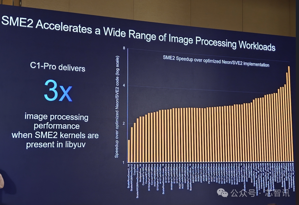SME2 還可加速各種圖像處理工作負載,比如在libyuv中,支持SME2的C1-Pro的圖像處理表現(xiàn)提升到了原來的3倍。