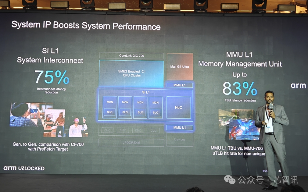 Lumex CSS平臺要支持 AI 優(yōu)先體驗,自然不能只局限于CPU、GPU等計算 IP 和前面提到的多核調(diào)度的DSU IP的提升,還必須在整個互連和內(nèi)存架構(gòu)層面持續(xù)演進。所以,Arm為了Lumex CSS平臺帶來了全新的SI L1和MMU L1和NoC S3等系統(tǒng)IP,專為滿足高要求 AI 和其他計算密集型工作負載的帶寬與延遲需求而優(yōu)化。