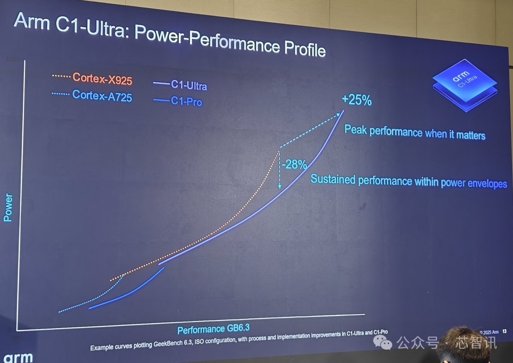 從Geekbench 6.3測試表現(xiàn)來看,在同等性能下,C1-Pro的功耗要比Cortex-A725低26%;在同等功耗下,C1-Pro的性能要比Cortex-A725高出11%。