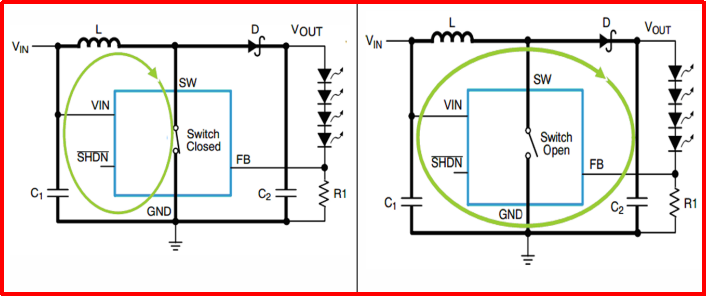 SL4139是一個高頻開關(guān)調(diào)節(jié)器。為了減少EMI,紋波和噪聲,高頻開關(guān)電流的走線必須被小心地布在電路板上。上圖中的加粗線顯示高頻開關(guān)電流的路徑。所有這些走線必須短和寬,目的是減少寄生電感和電阻。在下圖中,當(dāng) SL4139 內(nèi)部開關(guān)是關(guān)閉時,環(huán)路為電流路徑。SL4139內(nèi)部開關(guān)是打開時,環(huán)路為電流路徑。兩個環(huán)路區(qū)域應(yīng)盡可能小。
