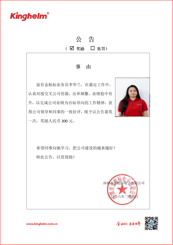 2026年02月02日到2026年02月06日,金航標(www.kinghelm.net)/薩科微(www.slkoric.com)“每周之星”經(jīng)過同事們評比,這周“每周之星” 是金航標業(yè)務員李華蘭,在最近工作中,認真對接交叉公司資源,出單頻繁,業(yè)績穩(wěn)中有升,以完成公司業(yè)績?yōu)槟繕藢虻墓ぷ骶瘢@得公司領導和同事的一致好評,現(xiàn)予以公告嘉獎一次,獎勵人民幣300。