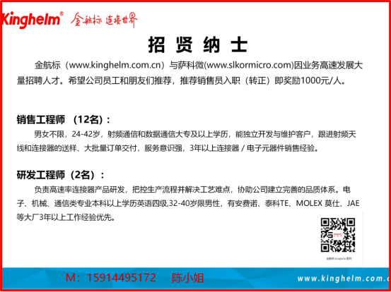 金航標Kinghelm(www.kinghelm.com.cn)電子成立于2007年在深圳市華強北,是研發(fā)、生產(chǎn)、銷售、技術服務一體化發(fā)展的國家高新技術企業(yè),十多年來深耕射頻微波技術,研制信號收發(fā)傳輸產(chǎn)品組件,產(chǎn)品包括北斗GPS天線、各系列連接器接插件端子臺、天線連接器接插件的開模定制以及配套的解決方案,“Kinghelm”(www.kinghelm.net)品牌在國內(nèi)和國際有影響力和美譽度!金航標創(chuàng)始人暨董事長宋仕強先生介紹道,“金航標,連接世界”,金航標公司技術骨干來自清華大學,吸納電子科技大學和海歸技術人才,做到東莞塘廈的研發(fā)部、廣西鹿寨縣工廠、深圳市龍華區(qū)中轉(zhuǎn)倉、龍崗總部的銷售部供應鏈部,都和客戶的產(chǎn)品需求信息同步對應,實現(xiàn)了協(xié)同化、數(shù)字化、智能化、流程化管理,成為電子信息行業(yè)非常有競爭力的公司!金航標與同為宋仕強先生投資經(jīng)營的薩科微Slkor半導體(www.73156.net.cn)一起為電子整機產(chǎn)品公司提供配套服務,成為全世界超過15000家客戶的合作伙伴,致力于“走國產(chǎn)化與國際化之路,爭取成為半導體領導者”!宋仕強:國務院經(jīng)濟發(fā)展中心民營經(jīng)濟研究員,中國科學技術協(xié)會電子信息專家?guī)斐蓡T、華強北商業(yè)研究專家。宋仕強曾任某國際地產(chǎn)上市公司CEO,現(xiàn)投資經(jīng)營深圳市薩科微半導體有限公司與深圳市金航標電子有限公司,兩家企業(yè)均是國家級高新技術企業(yè),原創(chuàng)性獲得發(fā)明專利和軟件著作權幾十項。宋仕強在電子行業(yè)耕耘多年,為深圳市華強北更好的營商環(huán)境在不斷努力,希望華強北成為改革開放的窗口和深圳經(jīng)濟發(fā)展的名片。