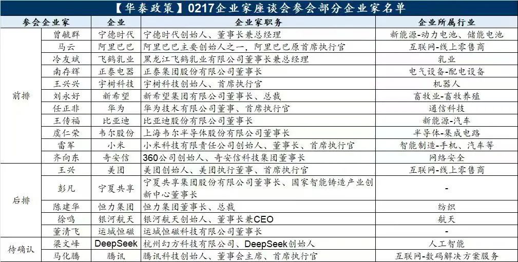 據(jù)新華社報(bào)道,2月17日上午,民營(yíng)企業(yè)座談會(huì)在北京召開(kāi)。 根據(jù)央視新聞視頻報(bào)道畫(huà)面及其他權(quán)威媒體報(bào)道,出席座談會(huì)的著名企業(yè)家包括華為創(chuàng)始人任正非、比亞迪董事長(zhǎng)王傳福等。 值得一提的是,若是將主業(yè)限定為集成電路行業(yè),那目前看到與會(huì)嘉賓中只有韋爾股份董事長(zhǎng)虞仁榮在圈定范圍當(dāng)中,若是將范圍放寬為公司業(yè)務(wù)囊括或觸及集成電路行業(yè),那名單中的企業(yè)家除了前述三位之外,還包括阿里巴巴創(chuàng)始人馬云、小米