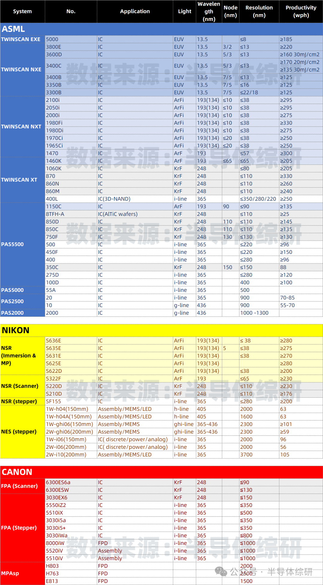 ASML、NIKON、CANON光刻機型號參數匯總