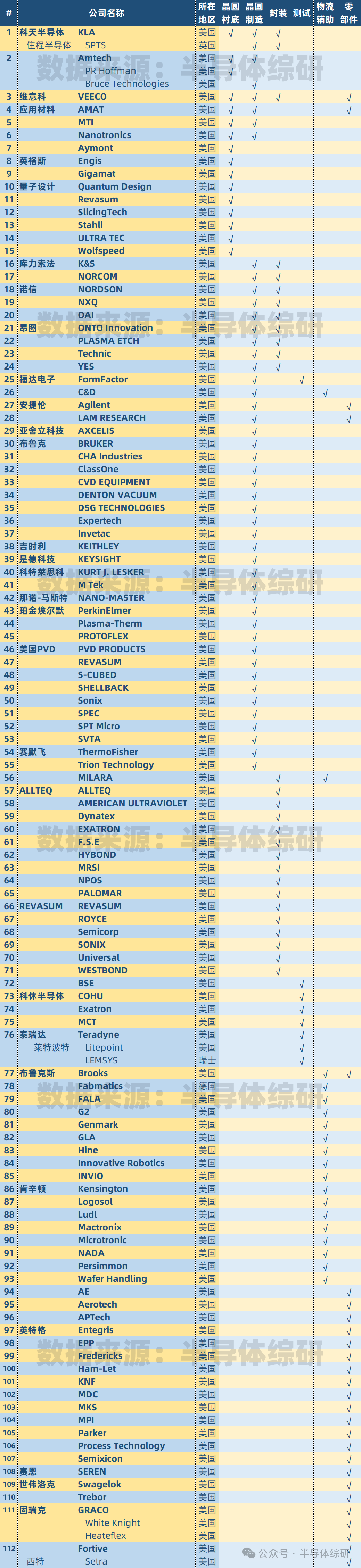 最近因為眾所周知的原因,國內半導體供應鏈安全的話題又在圈子內外變得異常熱絡起來 今天在公眾號上,我也趁熱度做一個美國半導體設備供應鏈的廠商盤點,讓大家理解一下美國作為全球第一大半導體設備供應國的目前的資源和能力 如果這篇文章讀者反響好,我后續考慮再做一系列材料、EDA/IP、CIM系統的美國供應鏈統計,供大家參考 如果大家發現任何問題,也歡迎私信和我聯系。謝謝了 注)某些非美的公司被美國公司收購了,所以我特意標注了每家公司的所在地信息,請理解 免責聲明:本文采